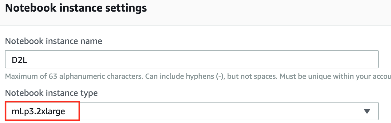 SageMaker provides multiple instance types with varying computational power and prices. When creating a notebook instance, we can specify its name and type. In Figure 23.2.3, we choose ml.p3.2xlarge: with one Tesla V100 GPU and an 8-core CPU, this instance is powerful enough for most of the book.