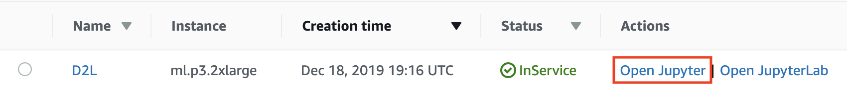 Creating an instance may take a few minutes. When it is ready, click on the “Open Jupyter” link next to it (Figure 23.2.5) so you can edit and run all the Jupyter notebooks of this book on this instance (similar to steps in Section 23.1).