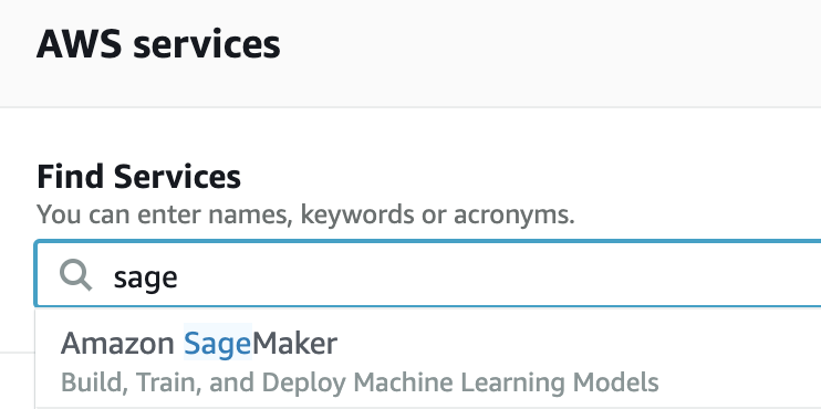 First, we need to sign up an account at https://aws.amazon.com/. For additional security, using two-factor authentication is encouraged. It is also a good idea to set up detailed billing and spending alerts to avoid any surprise, e.g., when forgetting to stop running instances. After logging into your AWS account, go to your console and search for “Amazon SageMaker” (see Figure 23.2.1), then click it to open the SageMaker panel.