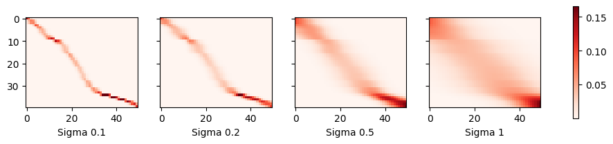 Clearly, the narrower the kernel, the less smooth the estimate. At the same time, it adapts better to the local variations. Let’s look at the corresponding attention weights.