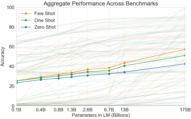 These three settings were tested in GPT-3 (Brown et al. 2020), whose largest version uses data and model size about two orders of magnitude larger than those in GPT-2. GPT-3 uses the same Transformer decoder architecture as its direct predecessor GPT-2 except that attention patterns (at the right in Figure 11.9.6) are sparser at alternating layers. Pretrained with 300 billion tokens, GPT-3 performs better with larger model size, where few-shot performance increases most rapidly (Figure 11.9.8).