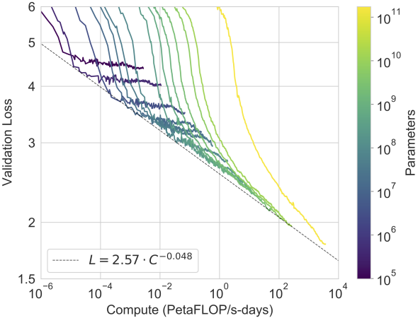 As shown in Figure 11.9.9, power-law scaling can be observed in the performance with respect to the model size (number of parameters, excluding embedding layers), dataset size (number of training tokens), and amount of training compute (PetaFLOP/s-days, excluding embedding layers). In general, increasing all these three factors in tandem leads to better performance. However, how to increase them in tandem still remains a matter of debate (Hoffmann et al. 2022).