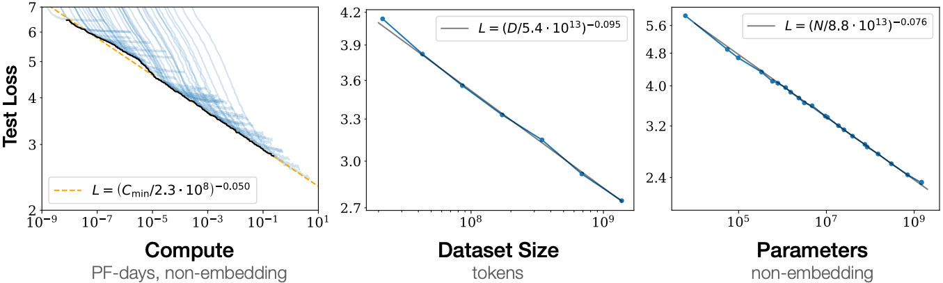 The empirical scaling behaviors in Kaplan et al. (2020) have been tested in subsequent large Transformer models. For example, GPT-3 supported this hypothesis with two more orders of magnitude in Figure 11.9.11.