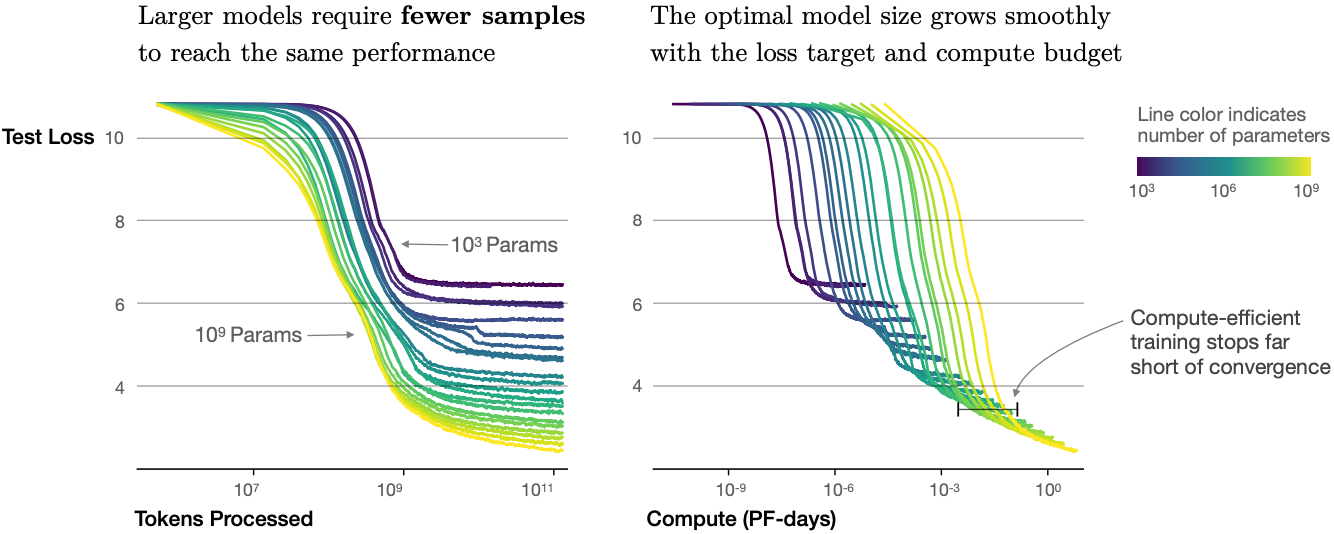 As well as increased performance, large models also enjoy better sample efficiency than small models. Figure 11.9.10 shows that large models need fewer training samples (tokens processed) to perform at the same level achieved by small models, and performance is scaled smoothly with compute.