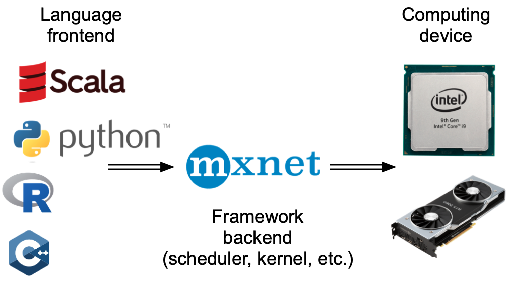 Broadly speaking, MXNet has a frontend for direct interactions with users, e.g., via Python, as well as a backend used by the system to perform the computation. As shown in Figure 13.2.1, users can write MXNet programs in various frontend languages, such as Python, R, Scala, and C++. Regardless of the frontend programming language used, the execution of MXNet programs occurs primarily in the backend of C++ implementations. Operations issued by the frontend language are passed on to the backend for execution. The backend manages its own threads that continuously collect and execute queued tasks. Note that for this to work the backend must be able to keep track of the dependencies between various steps in the computational graph. Hence, it is not possible to parallelize operations that depend on each other.