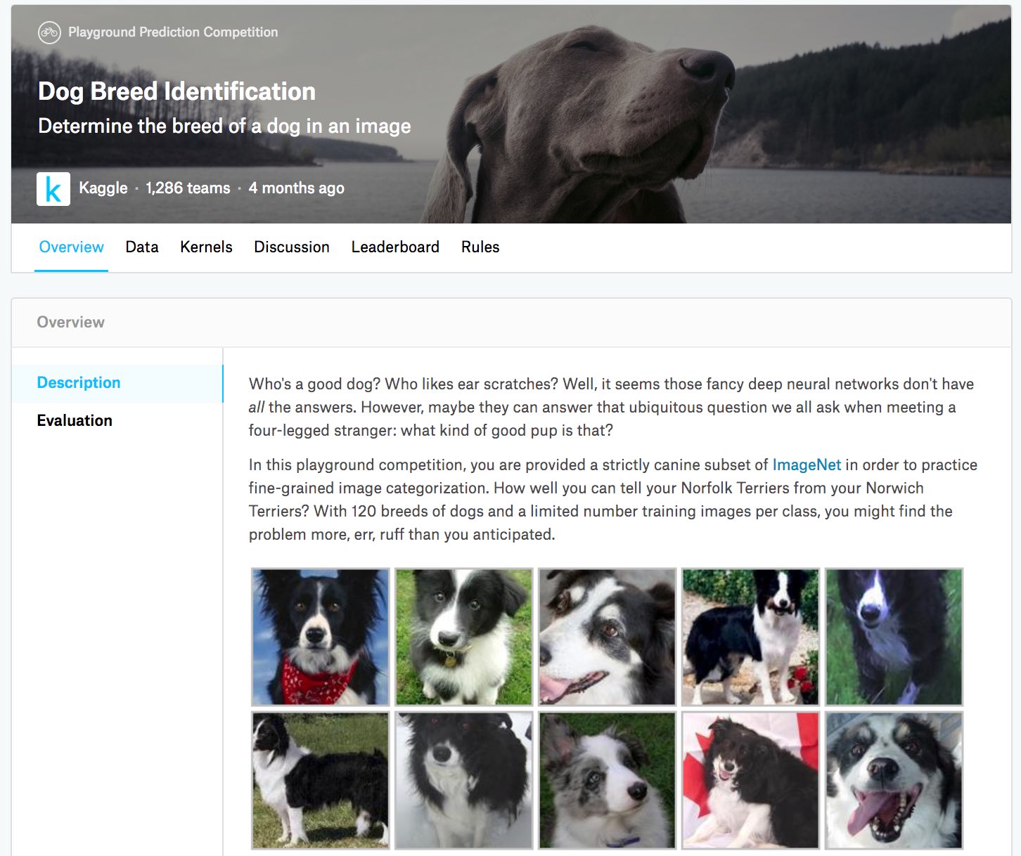 In this competition, 120 different breeds of dogs will be recognized. In fact, the dataset for this competition is a subset of the ImageNet dataset. Unlike the images in the CIFAR-10 dataset in Section 14.13, the images in the ImageNet dataset are both higher and wider in varying dimensions. Figure 14.14.1 shows the information on the competition’s webpage. You need a Kaggle account to submit your results.