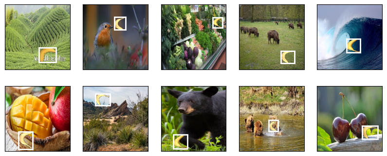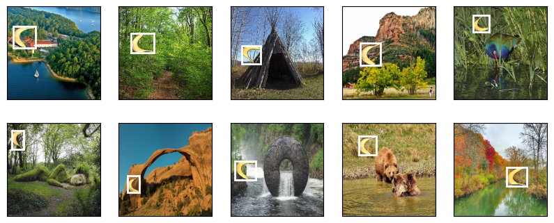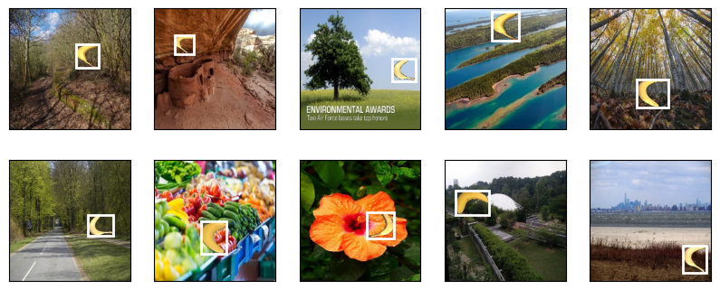 Let’s demonstrate ten images with their labeled ground-truth bounding boxes. We can see that the rotations, sizes, and positions of bananas vary across all these images. Of course, this is just a simple artificial dataset. In practice, real-world datasets are usually much more complicated.