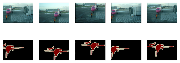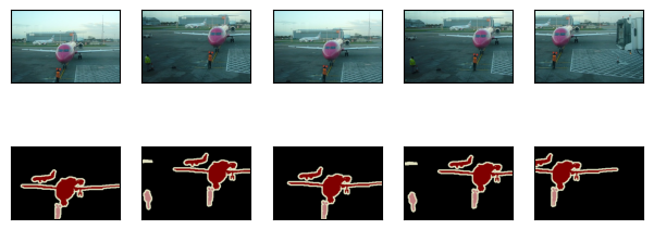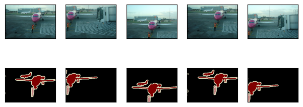 train_features, train_labels = read_voc_images(voc_dir, True)We draw the first five input images and their labels. In the label images, white and black represent borders and background, respectively, while the other colors correspond to different classes.