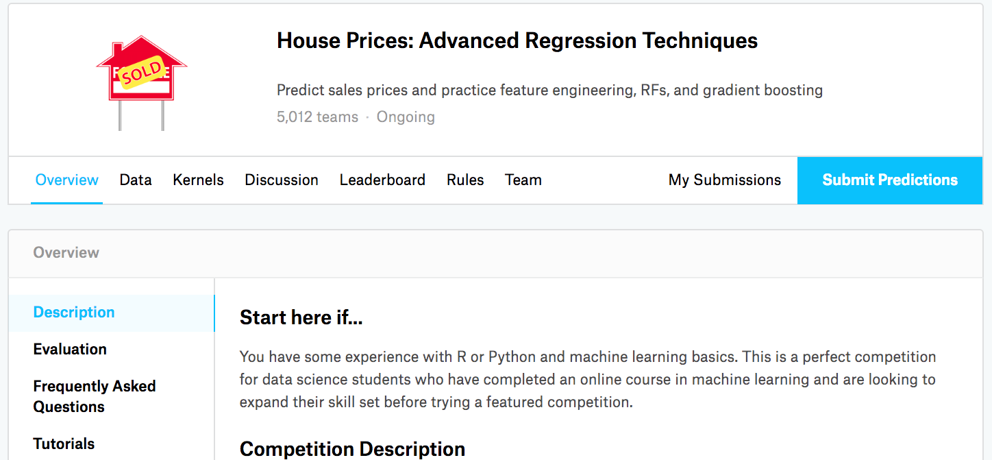 Note that the competition data is separated into training and test sets. Each record includes the property value of the house and attributes such as street type, year of construction, roof type, basement condition, etc. The features consist of various data types. For example, the year of construction is represented by an integer, the roof type by discrete categorical assignments, and other features by floating point numbers. And here is where reality complicates things: for some examples, some data is altogether missing with the missing value marked simply as “na”. The price of each house is included for the training set only (it is a competition after all). We will want to partition the training set to create a validation set, but we only get to evaluate our models on the official test set after uploading predictions to Kaggle. The “Data” tab on the competition tab in Figure 5.7.2 has links for downloading the data.