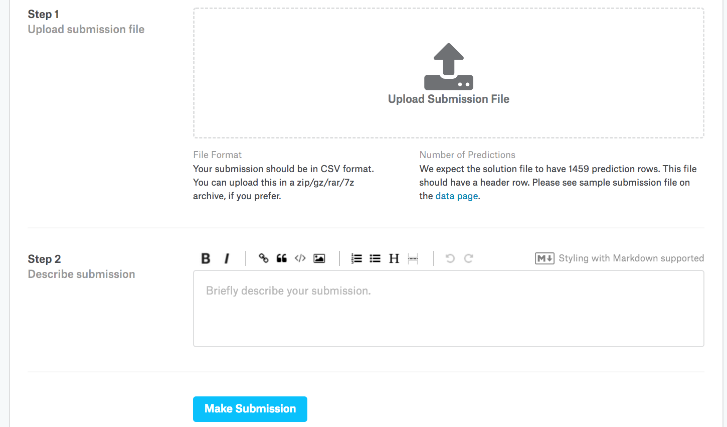 - Click the “Upload Submission File” button in the dashed box at the bottom of the page and select the prediction file you wish to upload.