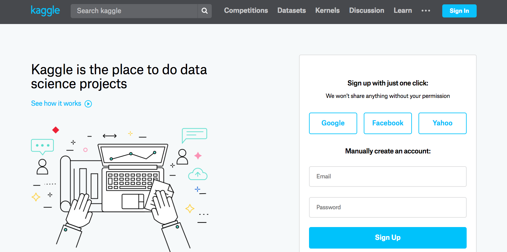 Kaggle is a popular platform that hosts machine learning competitions. Each competition centers on a dataset and many are sponsored by stakeholders who offer prizes to the winning solutions. The platform helps users to interact via forums and shared code, fostering both collaboration and competition. While leaderboard chasing often spirals out of control, with researchers focusing myopically on preprocessing steps rather than asking fundamental questions, there is also tremendous value in the objectivity of a platform that facilitates direct quantitative comparisons among competing approaches as well as code sharing so that everyone can learn what did and did not work. If you want to participate in a Kaggle competition, you will first need to register for an account (see Figure 5.7.1).