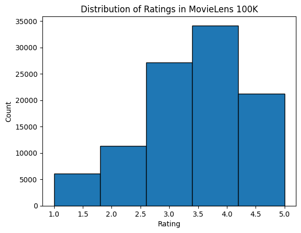 We can see that each line consists of four columns, including “user id” 1-943, “item id” 1-1682, “rating” 1-5 and “timestamp”. We can construct an interaction matrix of size \(n \times m\), where \(n\) and \(m\) are the number of users and the number of items respectively. This dataset only records the existing ratings, so we can also call it rating matrix and we will use interaction matrix and rating matrix interchangeably in case that the values of this matrix represent exact ratings. Most of the values in the rating matrix are unknown as users have not rated the majority of movies. We also show the sparsity of this dataset. The sparsity is defined as 1 - number of nonzero entries / ( number of users * number of items). Clearly, the interaction matrix is extremely sparse (i.e., sparsity = 93.695%). Real world datasets may suffer from a greater extent of sparsity and has been a long-standing challenge in building recommender systems. A viable solution is to use additional side information such as user/item features to alleviate the sparsity.